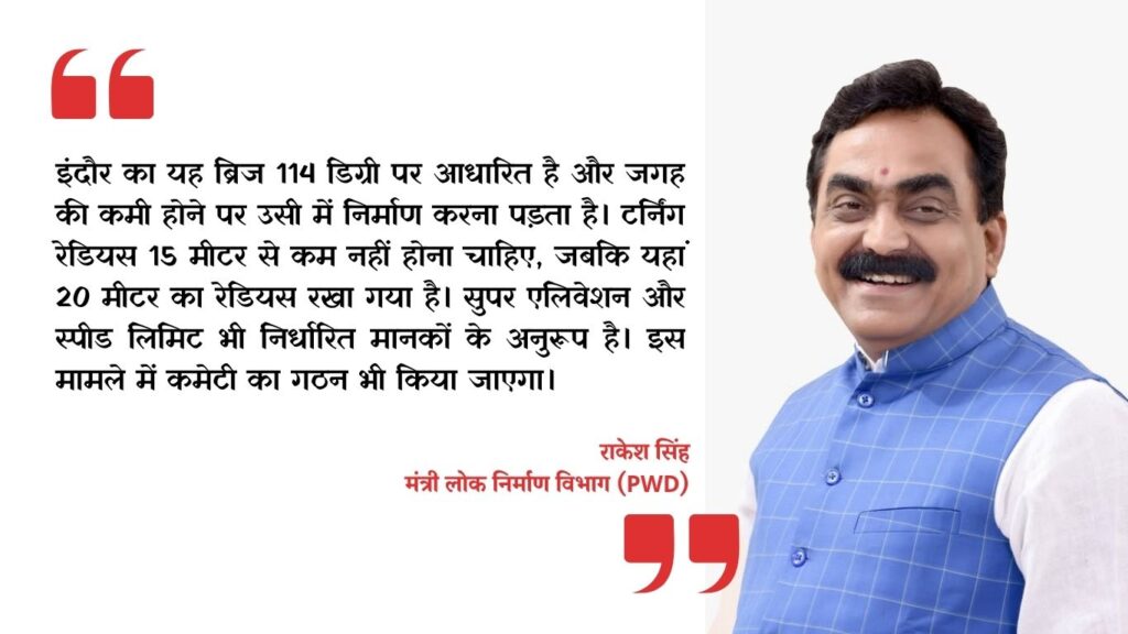 इंदौर के पोलोग्राउंड क्षेत्र में लोक निर्माण विभाग (PWD) द्वारा बनाए जा रहे Z आकार के रेलवे ओवर ब्रिज (ROB) को लेकर उठ रहे सवालों पर विभागीय मंत्री राकेश सिंह ने सफाई दी है। उन्होंने कहा कि ब्रिज का निर्माण निर्धारित मानकों के अनुसार ही किया जा रहा है और इसमें कोई गड़बड़ी नहीं है।